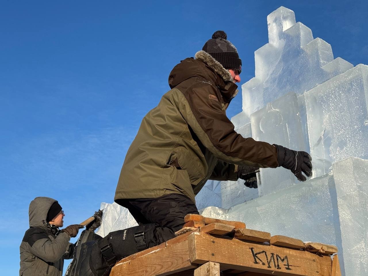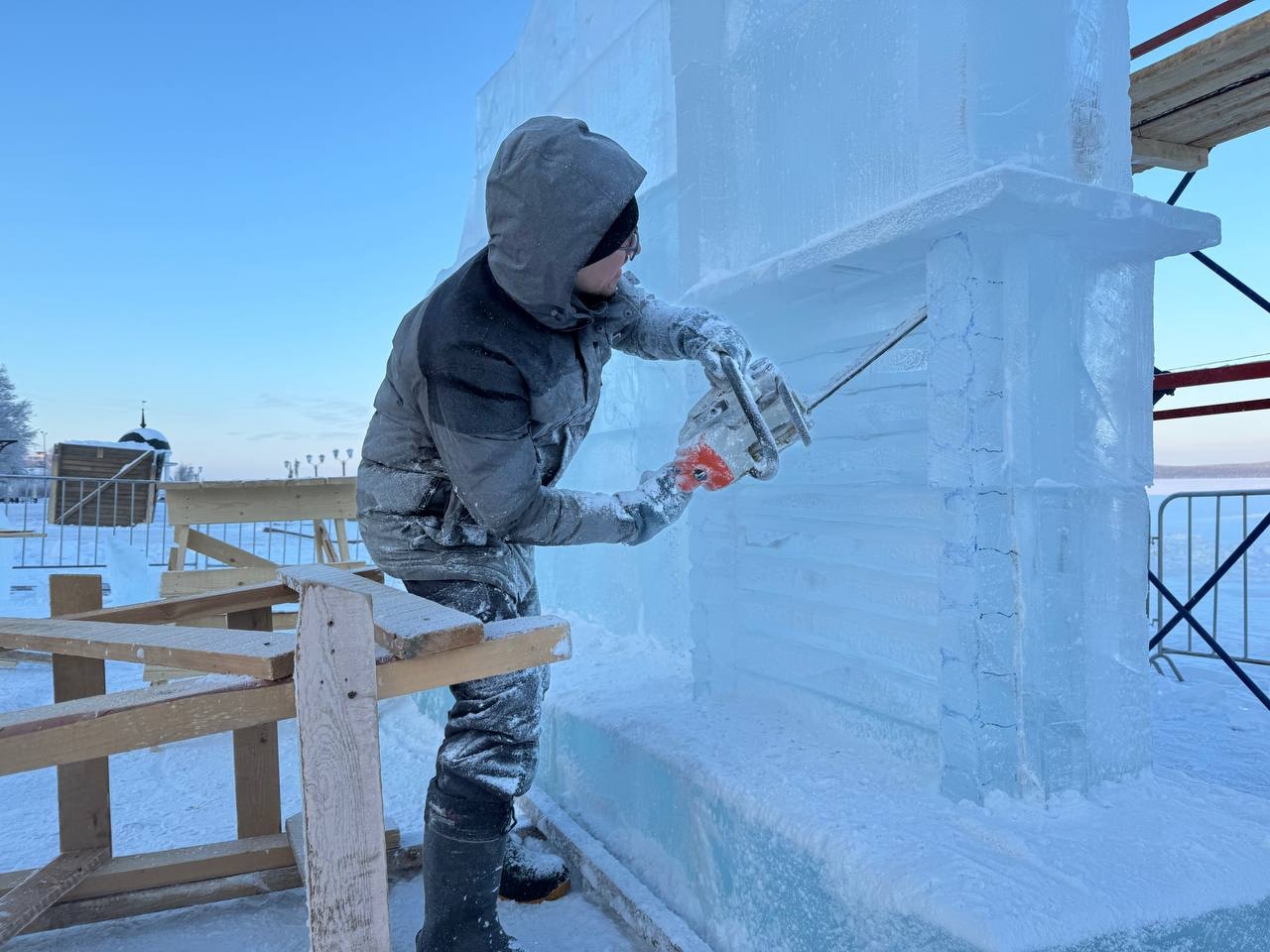 Завершается работа над ледяной скульптурой к 60-летию музея «Кижи» на Онежской набережной у здания администрации Петрозаводска
