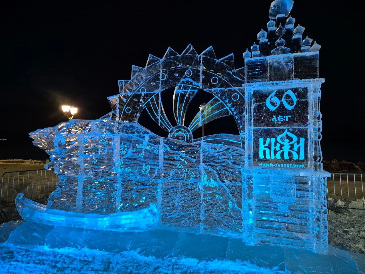 Завершена работа над ледяной скульптурой к 60-летию музея «Кижи» на набережной Онежского озера у Петрозаводской мэрии