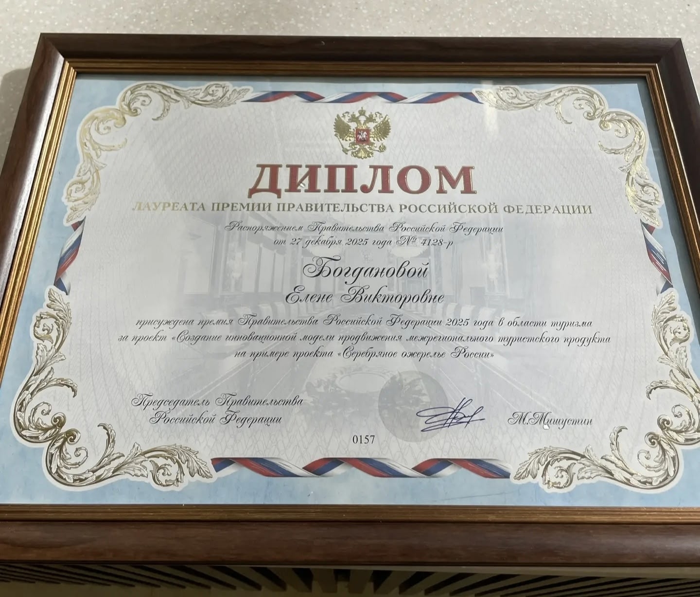 Премии Правительства Российской Федерации в области туризма за 2025 год удостоен коллектив авторов за проект «Создание инновационной модели продвижения межрегионального туристского продукта на примере проекта «Серебряное ожерелье России». В числе награжденных: директор музея-заповедника «Кижи» Елена Богданова; аспирант Санкт-Петербургского университета технологий управления и экономики Сергей Корнеев; исполнительный директор ООО «Маркет АБ» Анна Лупинова; главный редактор газеты «Петербургский дневник» Кирилл Смирнов.