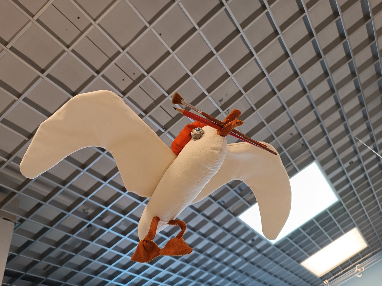 Под парусом полным ходом отправился в путь арт-корабль, вокруг него парят чайки, держа в клювах карандаши и кисточки, на горизонте – заповедный остров, на палубе – шумная команда, ростом до 150 см, в тельняшках, на капитанском мостике – художник Светлана Петрякова, идейный вдохновитель и автор выставки, посвященной 20-летию студии «Кижская палитра».