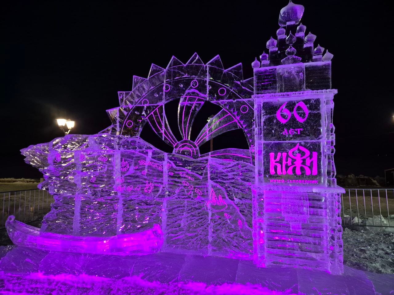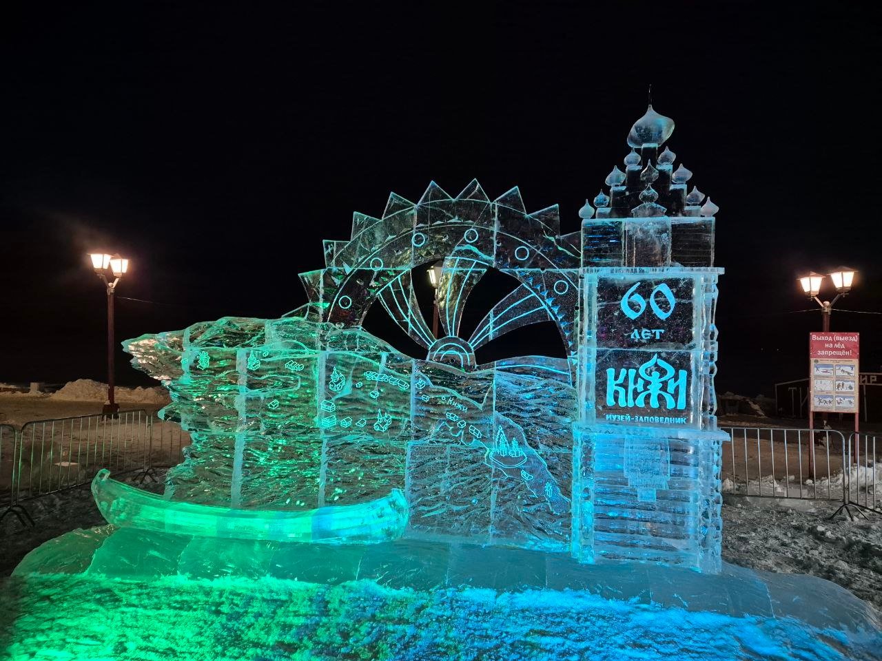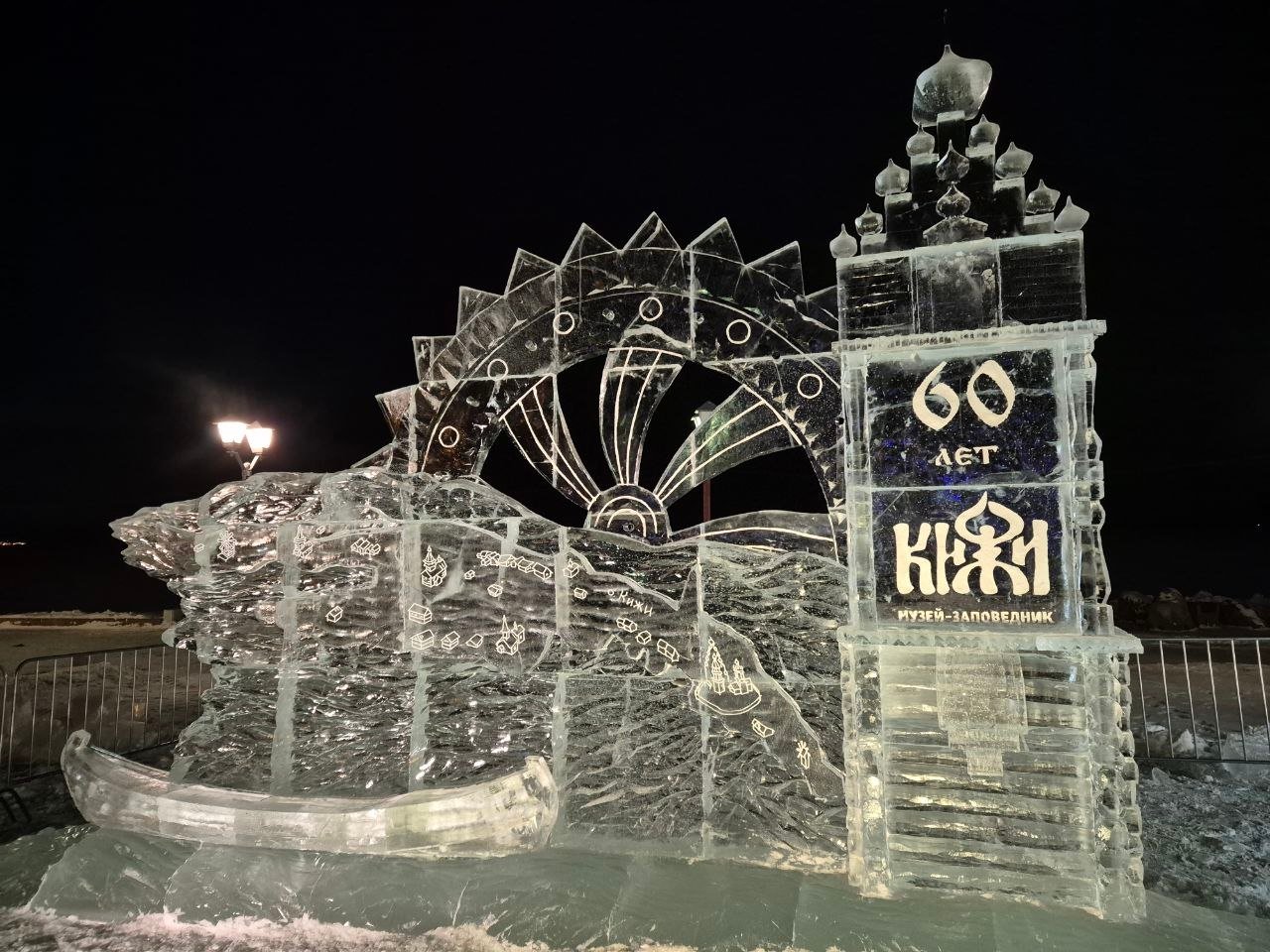 Завершена работа над ледяной скульптурой к 60-летию музея «Кижи» на набережной Онежского озера у Петрозаводской мэрии.