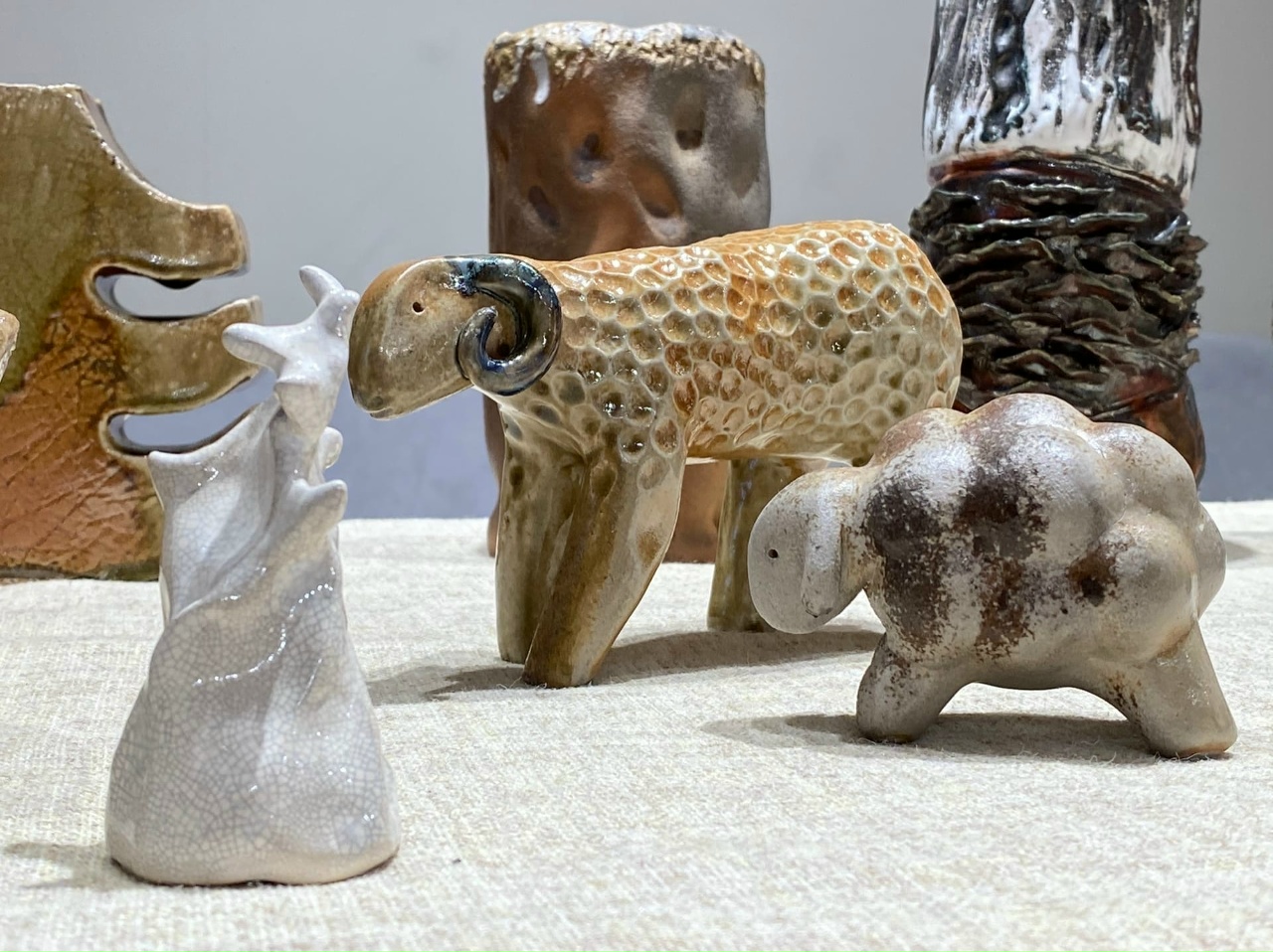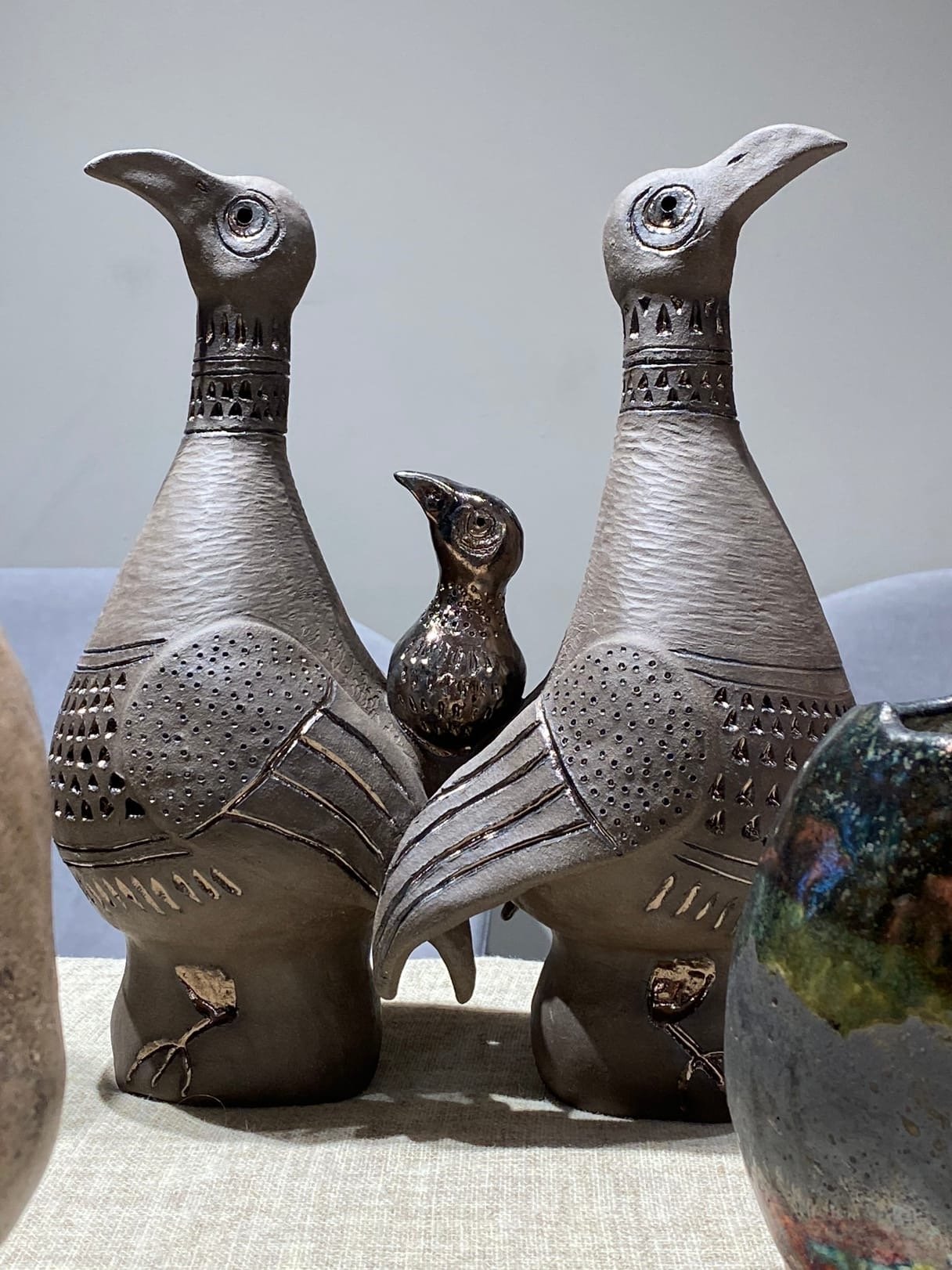 О карельском прочтении американской вариации старинной японской керамики «раку» рассказала студентка Петрозаводского университета Софья Володина. Изделия обжигают при температуре свыше тысячи градусов, а затем извлекают из печи горячими и помещают в емкости с обрывками бумаги, ткани и прочих горючих материалов. В результате, как и в случае с «Айно», каждое изделие приобретает индивидуальные черты, которые нельзя в точности повторить. Сделанная в Карелии керамика «раку» также представлена на выставке.