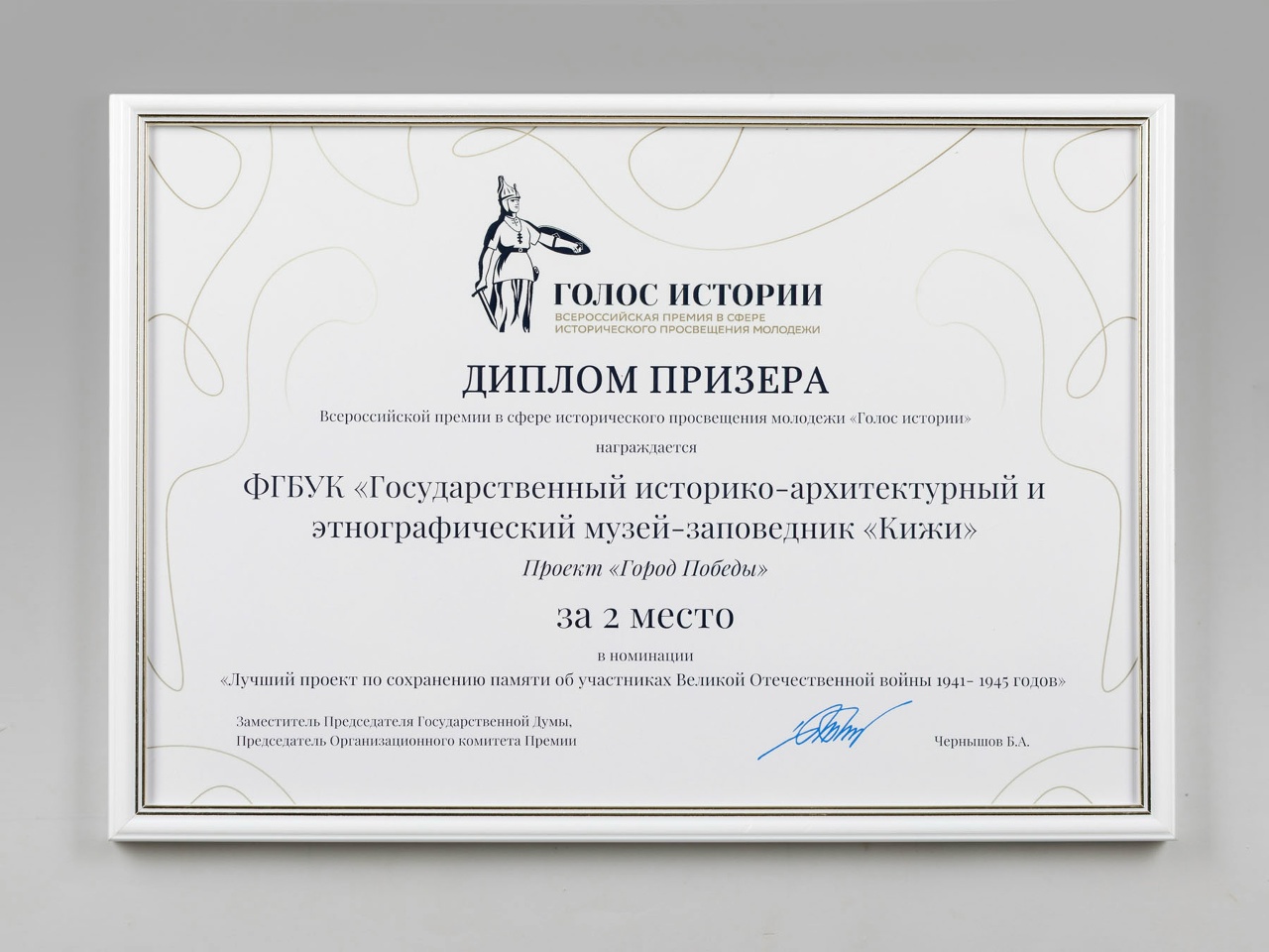 Праздник «Город Победы» проведенный музеем «Кижи» к 80-летию Великой Победы и годовщине освобождения Петрозаводска, стала лауреатом Всероссийской премии в сфере исторического просвещения молодежи «Голос истории», заняв второе место в номинации «Лучший проект по сохранению памяти об участниках Великой Отечественной войны 1941—1945 годов».
