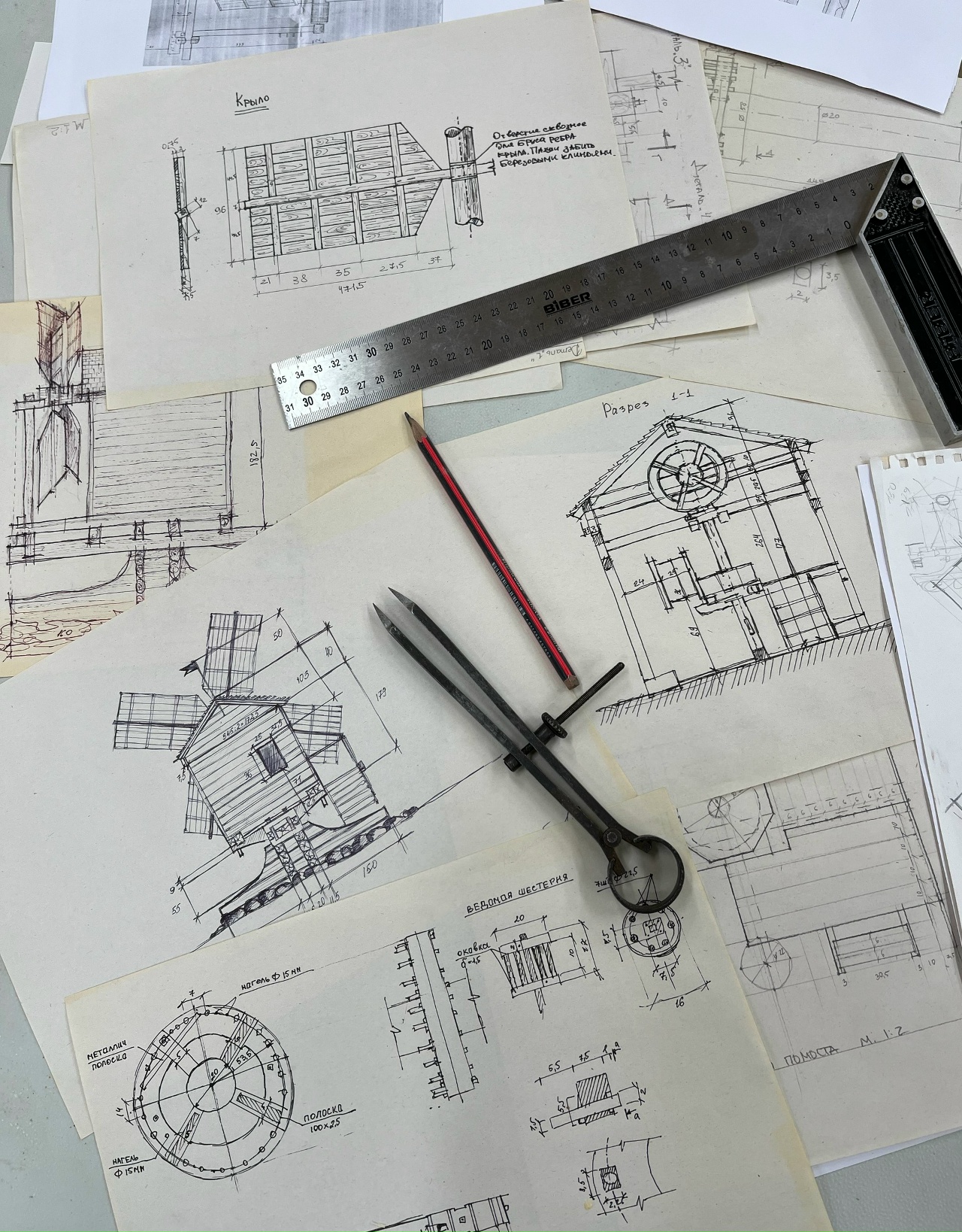 На сегодняшний день выполнена крестовина-основание мельницы и изготовлено большое количество элементов для дальнейшей работы.