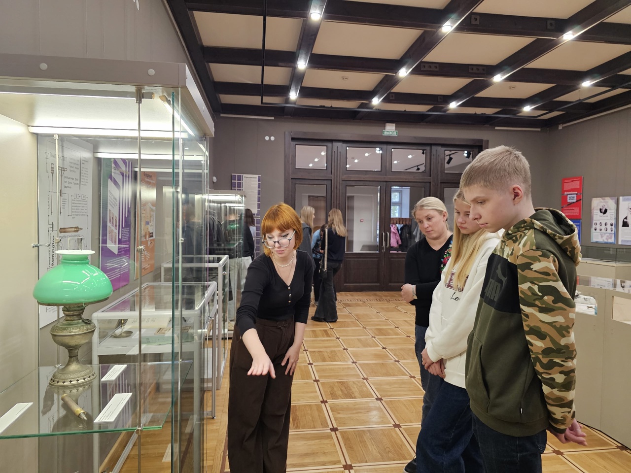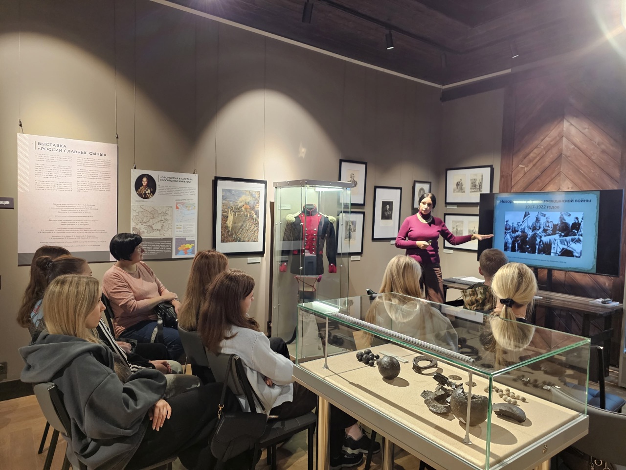 Сотрудник музея Марина Струкова провела интерактивную экскурсию о предпосылках Отечественной войны 1812 года, Великой Отечественной войны 1941—1945 гг. и Специальной военной операции. Ребята показали высокий уровень знаний по истории, а их особое внимание привлекли подлинные предметы из музея-заповедника «Бородинское поле»: трофейное оружие, амуниция, артефакты с полей сражений.