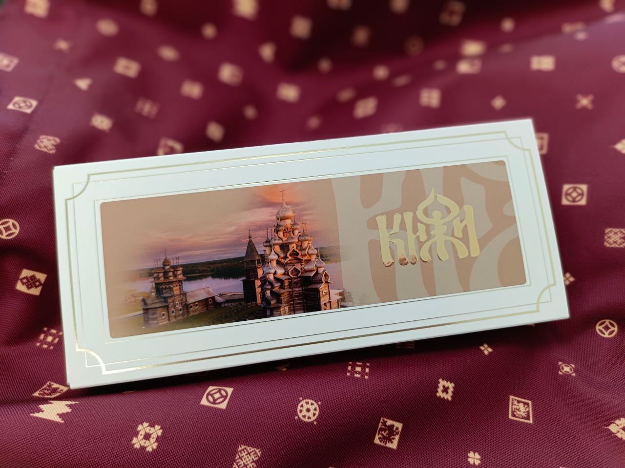 Шоколадные конфеты в упаковке с видами кижских памятников