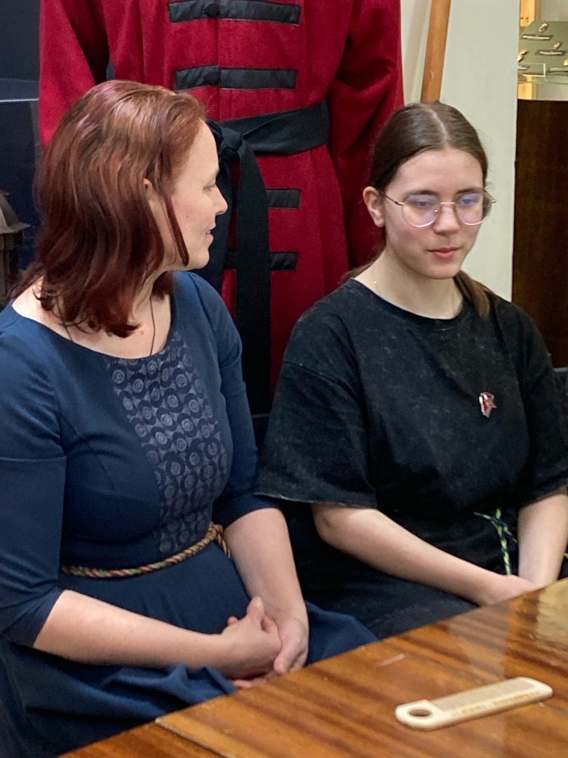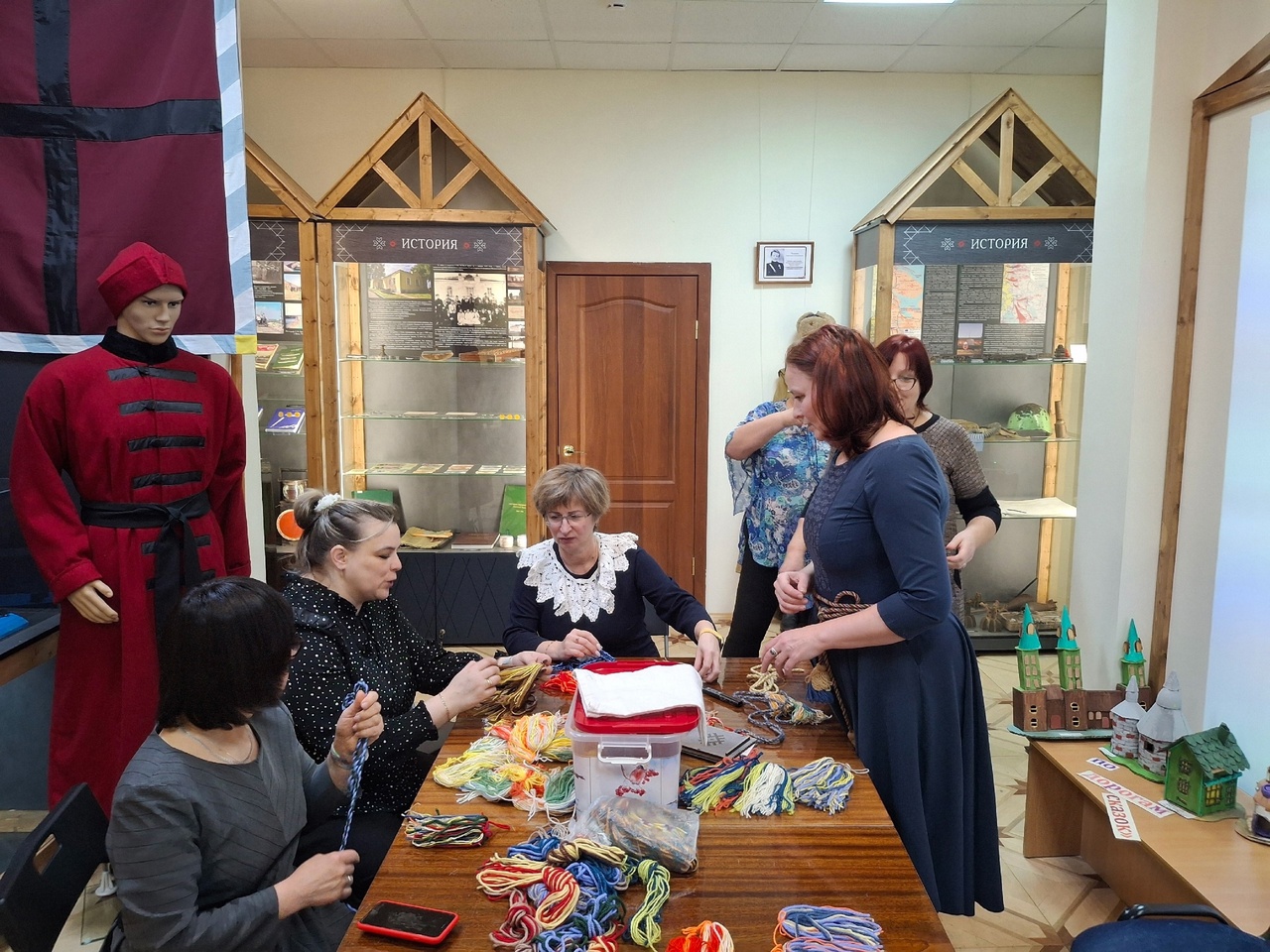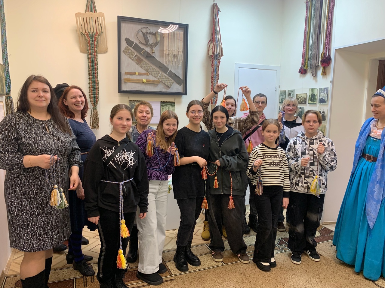 С интересом рассматривали гости экспонаты, множество фотографий, разнообразные приспособления для плетения - маленькие деревянные дощечки — станочки, бердо, челнок.