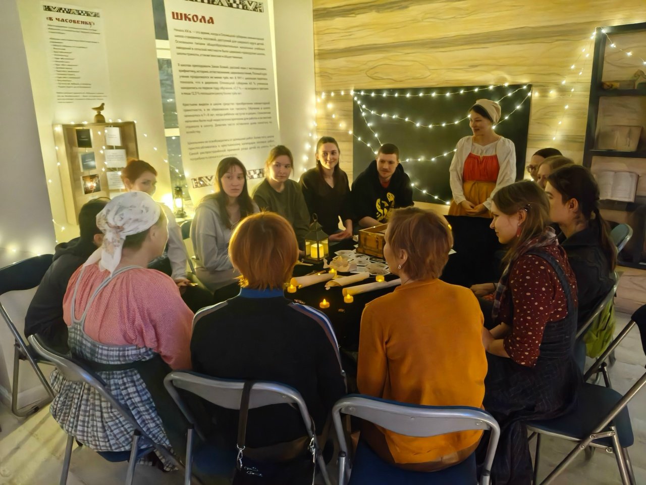Под чутким руководством ведущего участники разгадывали хитроумные головоломки, знакомились со значениями предметов в гаданиях. Вместе с фольклорным ансамблем «Кижи» побывали на молодежных беседах, участвовали в танцах и святочных играх.