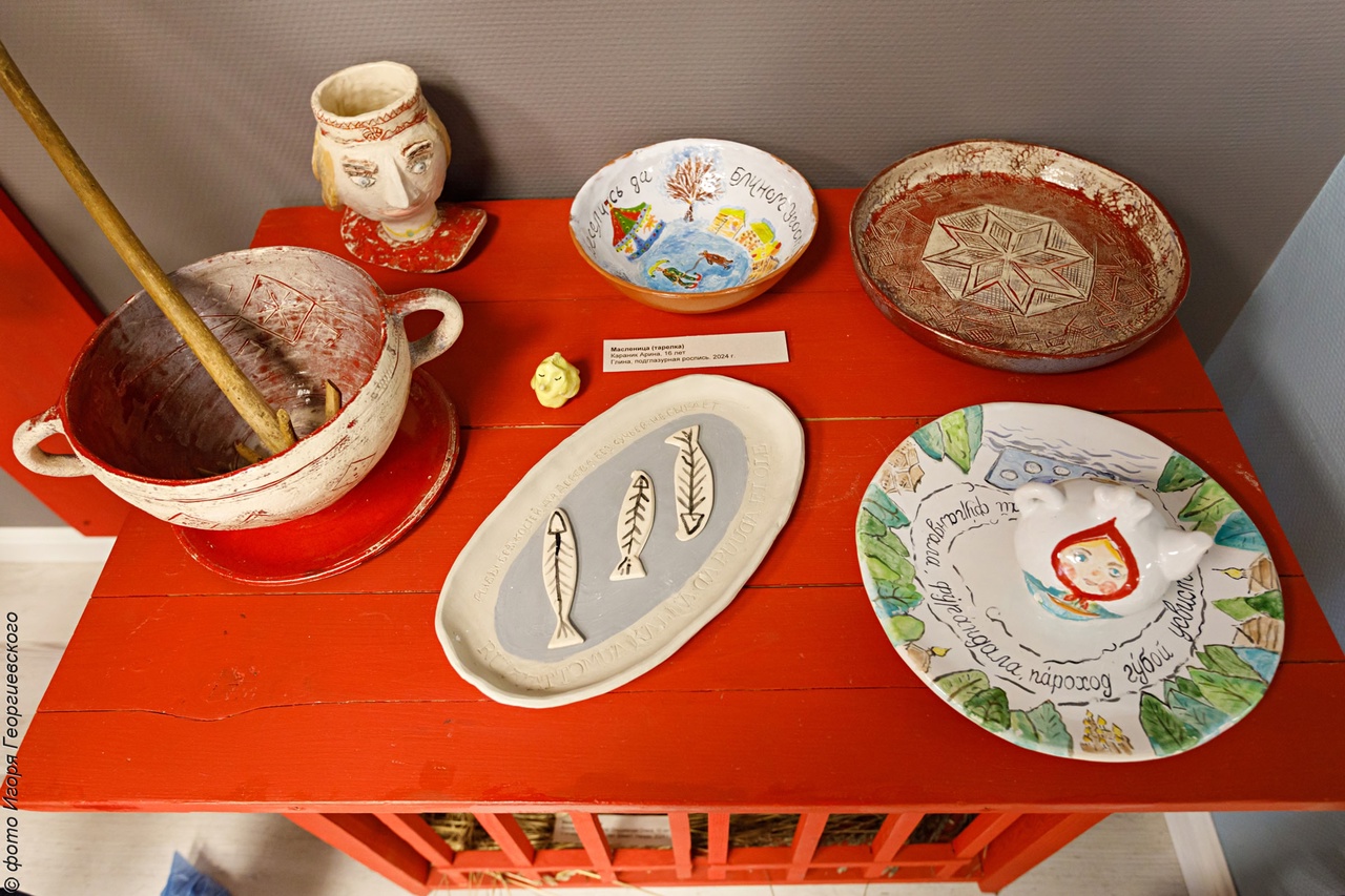 На выставке представлены керамические изделия и рисунки, выполненные участниками детской музейной студии «Кижская палитра».